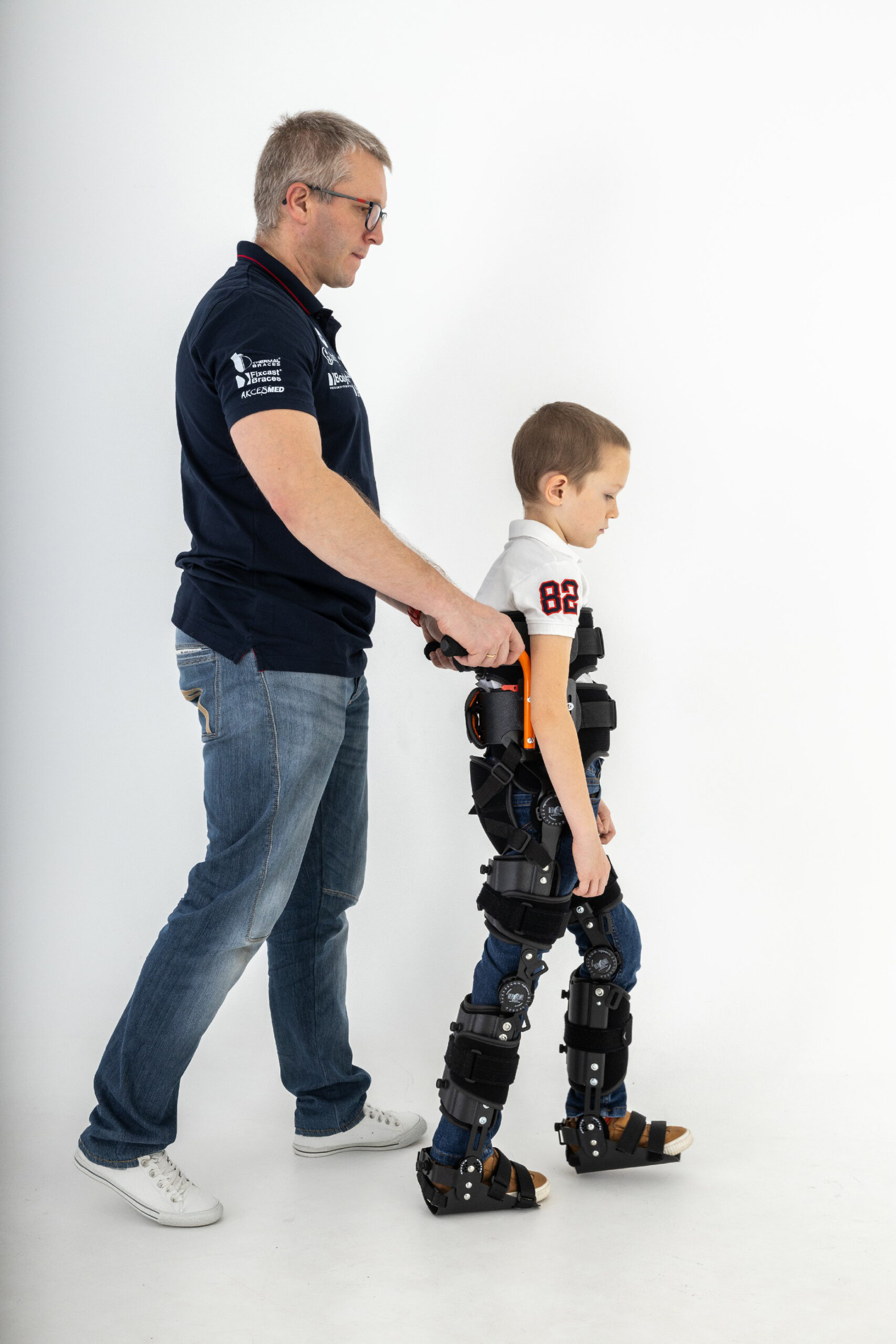 Co ważne, szyny po stronie przyśrodkowej kończyn dolnych zostały połączone specjalnym łącznikiem, który uniemożliwia dziecku nadmierne odwodzenie nóg w trakcie chodu i wykorzystując zalety plastyczności mózgu, „pokazuje” dziecku prawidłowy wzorzec chodu.